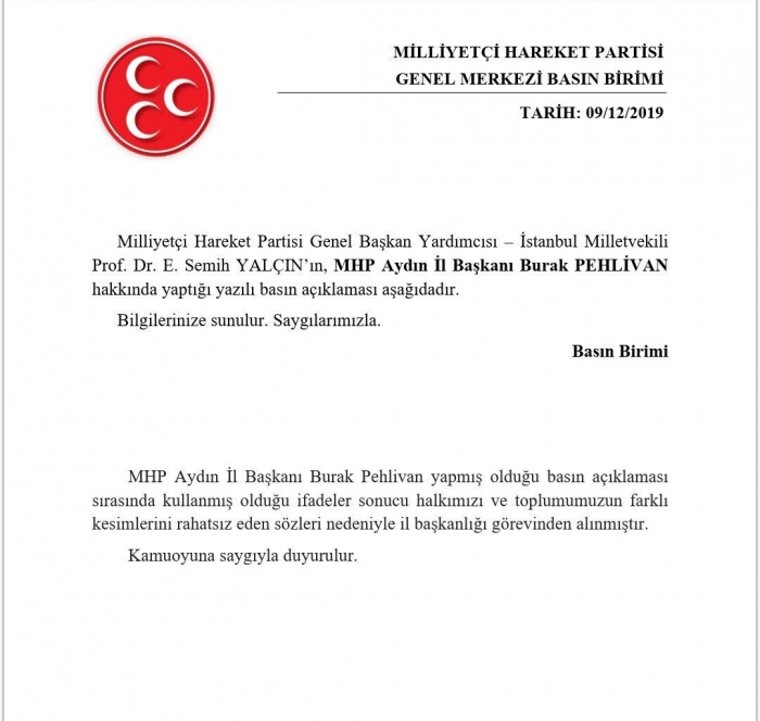 'MHP Aydın İl Başkanı Burak Pehlivan yapmış olduğu basın açıklaması sırasında kullanmış olduğu ifadeler sonucu halkımızı ve toplumumuzun farklı kesimlerini rahatsız eden sözleri nedeniyle il başkanlığı görevinden alınmıştır.'