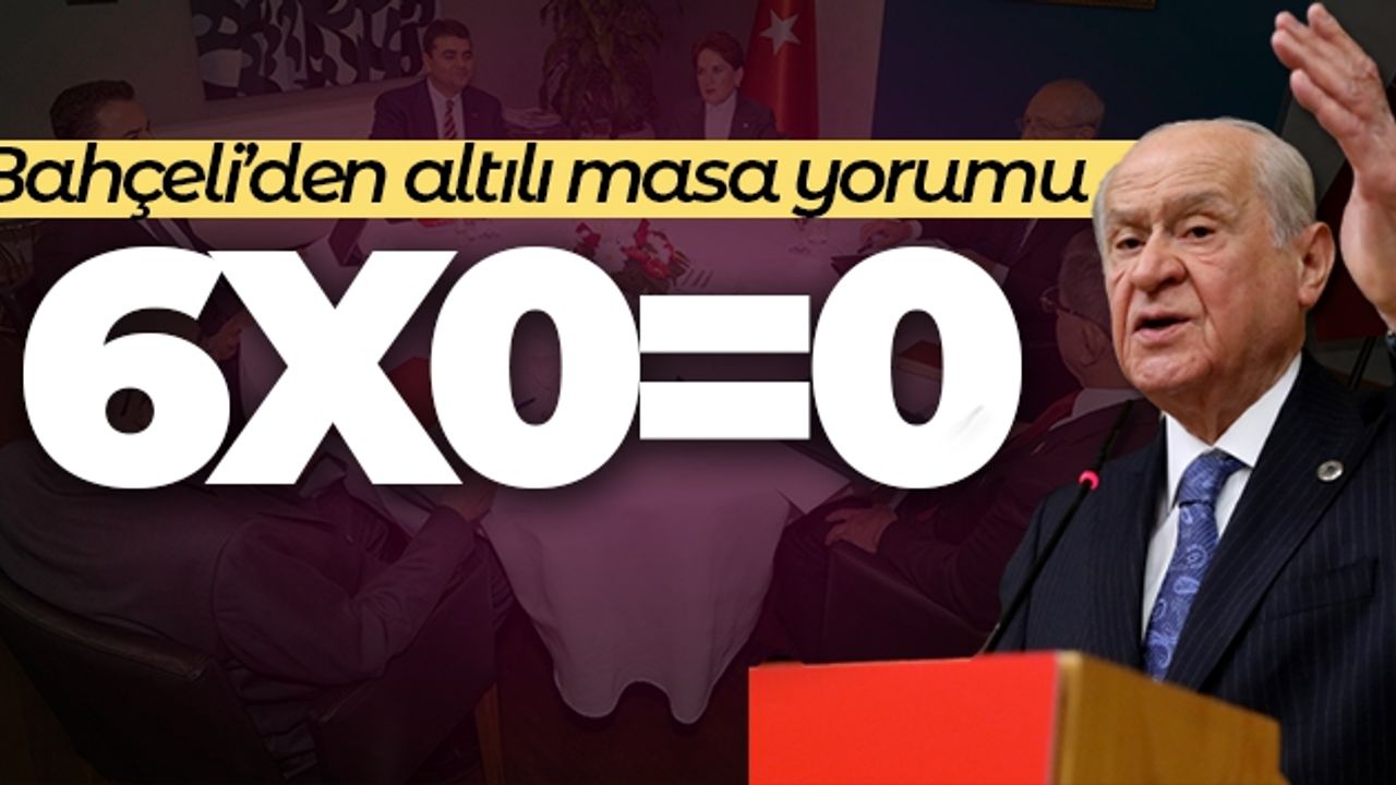 Bahçeli, Altılı Masa ile ilgili, 'Ben bir formülünü buldum. Onun formülü şu; altı çarpı sıfır eşittir sıfır. 6'lı masa bugüne kadar on toplantı yaptı. Yeni bir toplantı yapacaklar. Bu denklemi o toplantının sonucu üzerine kurdum' dedi.
