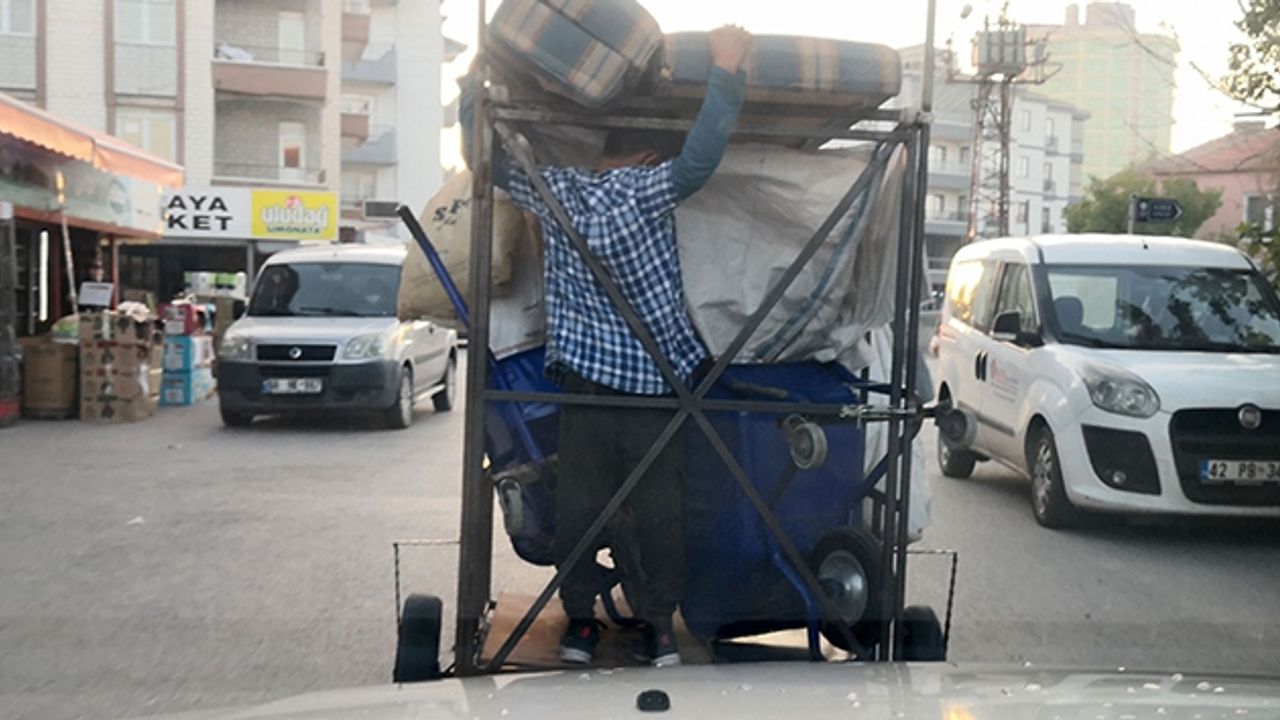 Olay, Aksaray merkezde yaşandı. Ev eşyası ve el arabası gibi bazı malzemeleri motosikletinin arkasına bağladığı römorka yükleyen yabancı uyruklu motosiklet sürücüsü, yanında bulunan 5 ve 9 yaşındaki 2 çocuğundan birini motosikletin arkasına, diğerini de yer bulamayınca römorka yüklediği eşyaların üzerine bindirdi. Daha sonra 14 AAN 532 plakalı motosikletiyle yolculuğa başlayan motosiklet sürücüsü herkesin yüreğini ağzına getirdi. Römorkun üzerindeki eşyaların üzerinde güçlüklü durabilen 9 yaşındaki çocuk zaman zaman virajlarda düşme tehlikesi geçirirken, bu yolculuk kilometrelerce sürdü. Bir ara eşyaların üzerinden inen çocuk, bu sefer römorktaki eşyaların altına girerek ikinci tehlikeli yolculuğuna başladı. Römorkun üzerindeki eşyaların altında da kilometrelerce süren yolculukta motosiklet sürücüsünün de kasksız olması dikkat çekti. Tüm bu yaşananlar ise bir otomobilin güvenlik kamerasına yansıdı. Görenlerin hayrete düştüğü olay vatandaşlar tarafından 112 Acil Çağrı Merkezi'ne bildirildi. İhbar üzerine harekete geçen İl Emniyet Müdürlüğü Trafik Tescil ve Denetleme Şube Müdürlüğü ekipleri kısa sürede motosiklet sürücüsünü seyir halinde yakalayarak tehlikeli yolculuğa son noktayı koydu. Motosiklet ve şahıs üzerinde detaylı inceleme ve sorgulama yapan trafik polisleri, şahsa idari para cezası kesti.