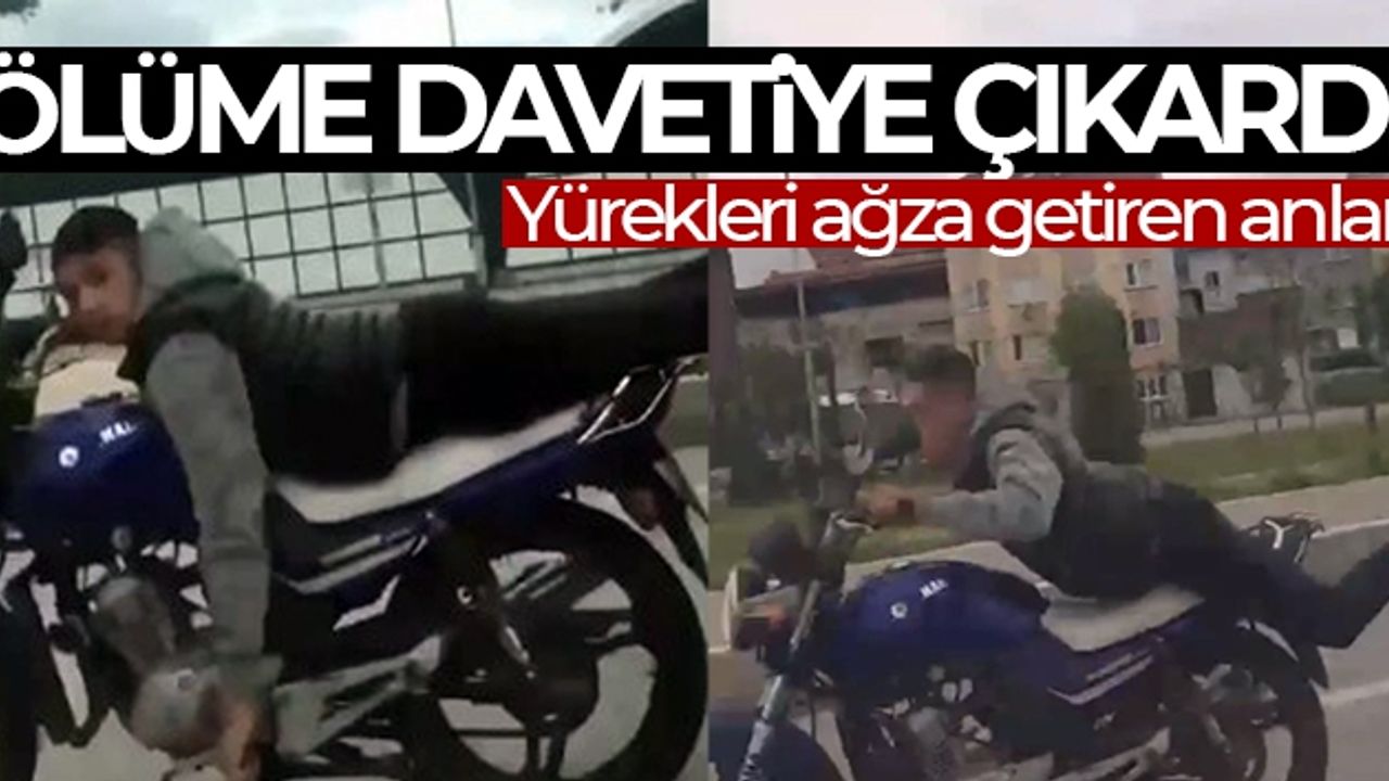 Olay, İnegöl ilçesinde meydana geldi. Edinilen bilgiye göre, motosikletin üstüne uzanarak giden genci görenler şaşkına döndü. Kendi canını hiçe sayan genci gören başka bir sürücü bu anları cep telefon kamerası ile kayıt altına aldı.