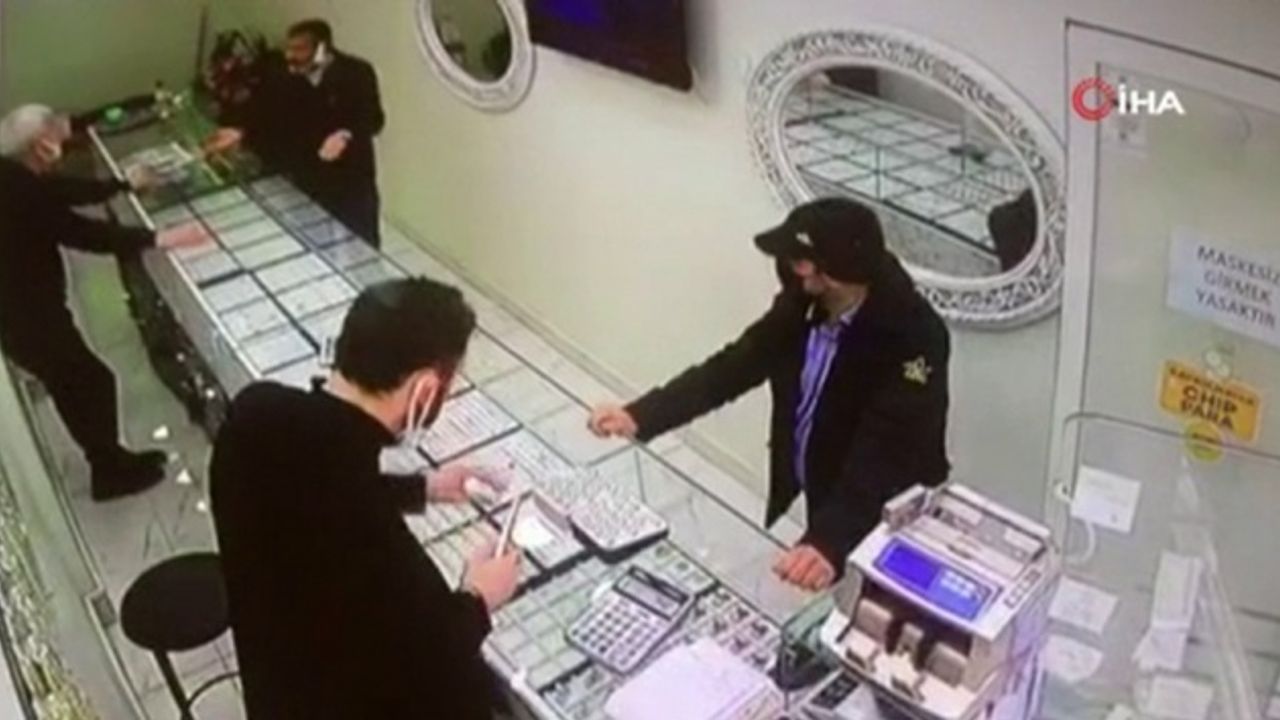 İçinde müşteri dolu olan kuyumcudan alyans tablasını çaldığı anlar güvenlik kamerasına yansıdı. Görüntülerde, hırsızın müşteri kılığında geldiği ve alyansları denediği sırada alyans tablasını alarak kaçtığı ve kuyumcudakilerinde kovaladığı görülüyor.