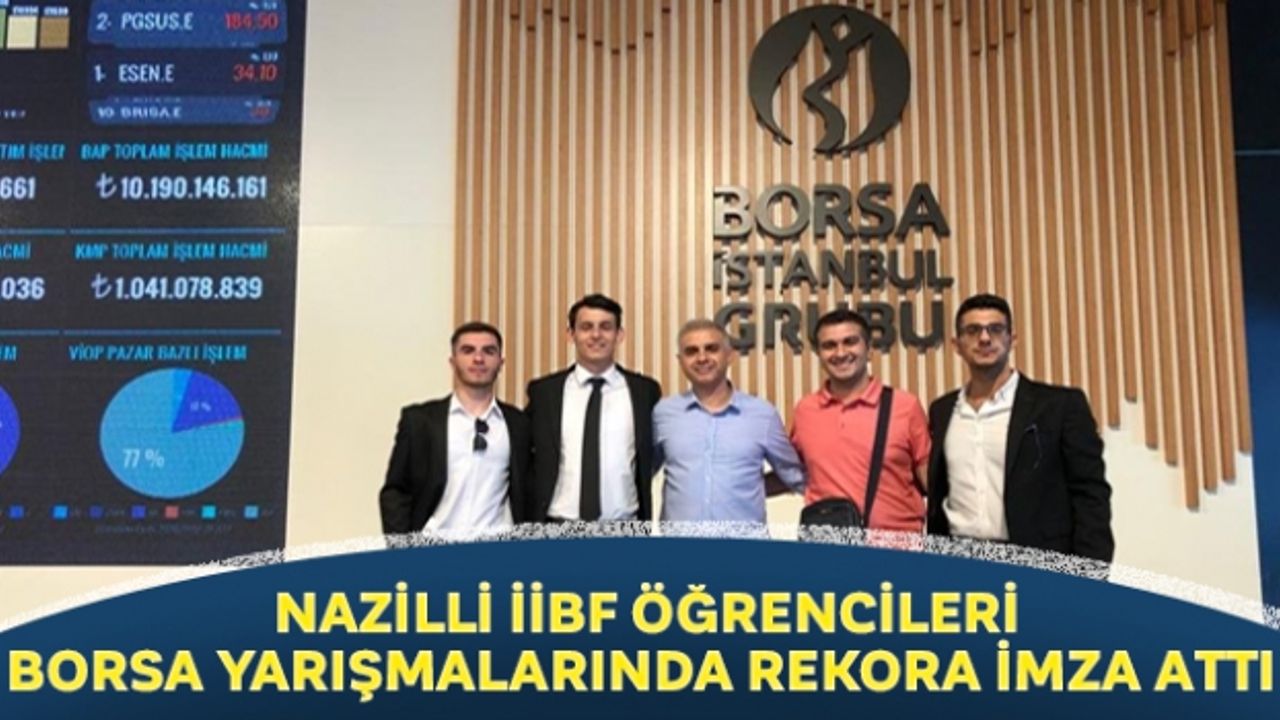 Aydın Adnan Menderes Üniversitesi (ADÜ) Nazilli İktisadi İdari Bilimler Fakültesi (İİBF) öğrencileri, finansal okuryazarlık seviyesinin yükselmesine katkı sağlamak, gençleri para yönetimi konusunda bilinçlendirmek ve farkındalık oluşturmak amacıyla düzenlenen borsa alanında katıldıkları 12 yarışmada elde ettikleri şampiyonluk ve dereceler ile rekora imza attı. Düzenlenen 12 yarışmada Nazilli İİBF öğrencileri bu yarışmaların büyük çoğunluğunda şampiyon oldu ve ikincilik derecesi aldı. Konu ile ilgili ADÜ tarafından yapılan paylaşımda 'Öğrenciler, 12 yarışmada şampiyonluk veya ikincilik alarak bir daha herhangi bir üniversitenin neredeyse hiçbir zaman kıramayacağı bir rekora imza atmış oldu' ifadelerine yer verildi.