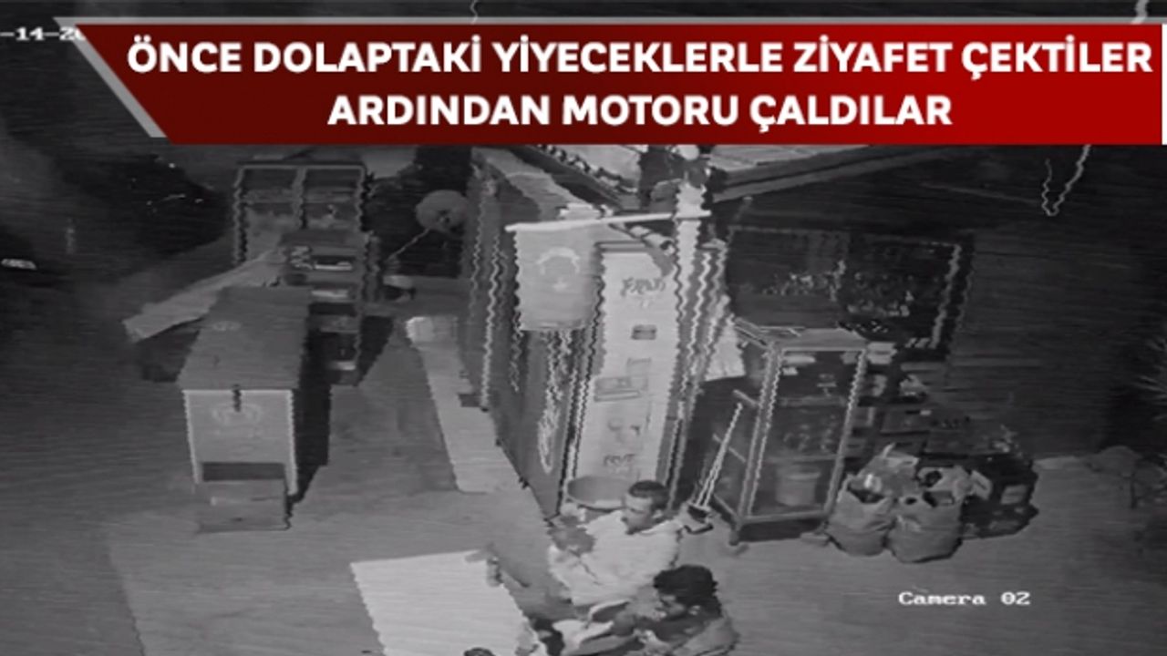 Aydın'ın Kuşadası ilçesinde bir marketin bahçesindeki dolaptan aldıkları yiyeceklerle kendilerine ziyafet çektikten sonra yol kenarındaki motosikleti çalan 2 şüpheliden biri polis ekipleri tarafından yakalandı. Kaçan diğer şüpheliyi yakalama çalışmaları sürerken, pişkin hırsızların o anları güvenlik kameralarına takıldı.