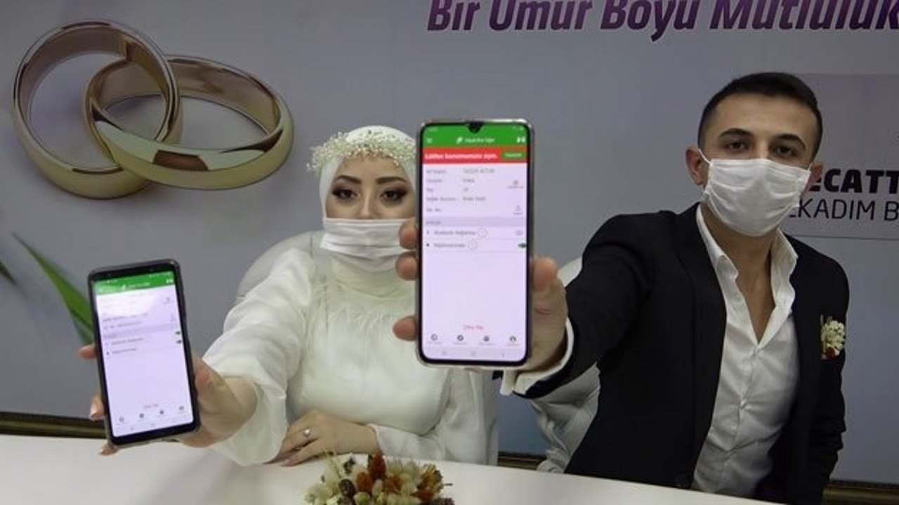 Evliliğe adım atan Özgür ve Pınar çiftinin nikah töreninde gülümseten anlar yaşandı. Nikah memuru 'İlkadım Belediyesinin bana vermiş olduğu yetkiye dayanarak sizlere HES kodu soruyorum' deyince önce biraz şaşkınlık, sonra da yüzlerde tebessüm oluştu. HES koduna bakan memur, genç çift risksiz çıkınca nikahı kıydı.