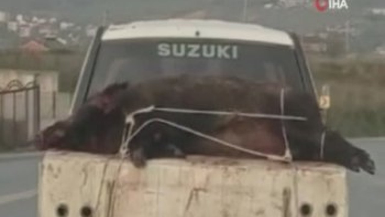 Arnavutköy Sevban Mehmet Caddesi üzerinde seyir halinde olan bir aracın kasasına bağlanmış domuzu gören vatandaşlar şaşkına döndü. O anlar cep telefonu kamerasıyla kayıt altına alındı.