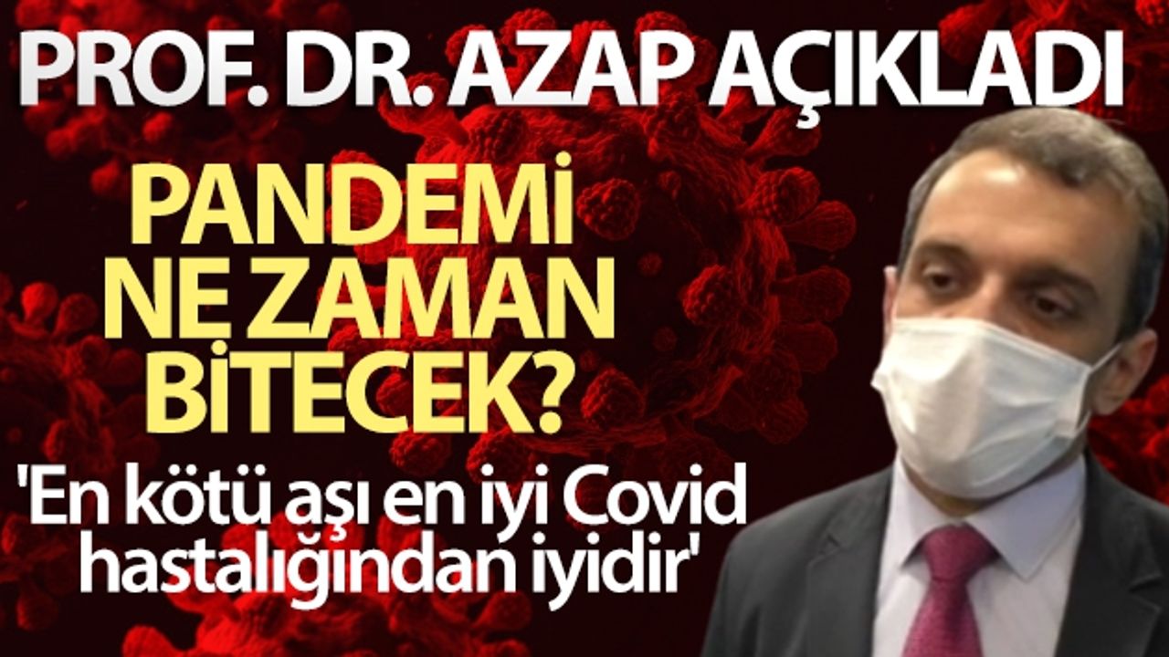 Pandeminin bitişine yönelik açıklamalarda bulunan Azap, 'Pandeminin bitişi muhtemelen önümdeki yılın ocak, şubat ayı olur diye bekliyoruz. Hindistan varyantı herkes merakla takip ediyor. Şunu söyleyemiyoruz henüz bu varyantlar orijinal virüse karşı çok daha öldürücü öyle bir veri henüz elimizde yok. Öyle bir değişim noktasına gelir ki artık daha önce geçirmiş olan kişilerin antikorları tanımaz bu virüsü ya da aşılanmış kişiler virüsü tanımaz ve yeniden salgında deyim yerindeyse başa dönmek gibi kötü bir durumla karşılaşırız. Henüz maskeyi çıkarabilecek durumda değiliz. Açık havada mesafeyi koruyamazsanız sürede uzarsa, açık havada olmanızın koruyucu etkisi ortadan kalkıyor. Maskesiz bir şekilde gündelik hayata devam edebilmenin koşulu aslında toplumda yeterli bağışıklığın oluşmuş olması. Önlemler gevşetilecek umarım kademeli bir şekilde gevşetilecek' dedi.