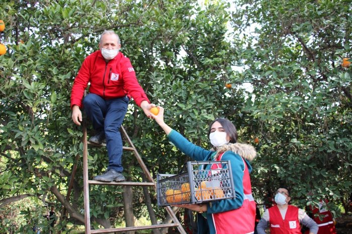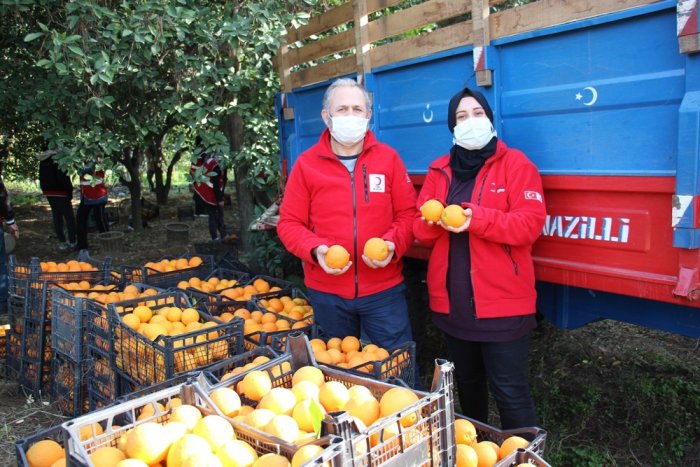 Türk Kızılay Aydın İl Kadın Kolları Başkanı Gönül Şahin Mezkit, 'Kızılay gönüllüsü arkadaşlarımız ile birlikte bir kısmı sağlık çalışanlarına, bir kısmı da ihtiyaç sahibi vatandaşlarımıza ulaştırılmak üzere 250 kasa portakal toplandı. Sokağa çıkma kısıtlaması olan bir günde evlerinde oturmak yerine bizlerle birlikte hayra vesile olmak için burada bulunan tüm gönüllülerimize teşekkür ediyorum. Bugün bir hayırsever vatandaşımızın bahçesinden portakalları toplamak için gelmiştik. Diğer üreticilerimiz de hayra ortak olmak isteyince bir kamyon dolusu portakal topladık. Allah hepsinden razı olsun. İyi ki güzel yürekli insanlar var' dedi.