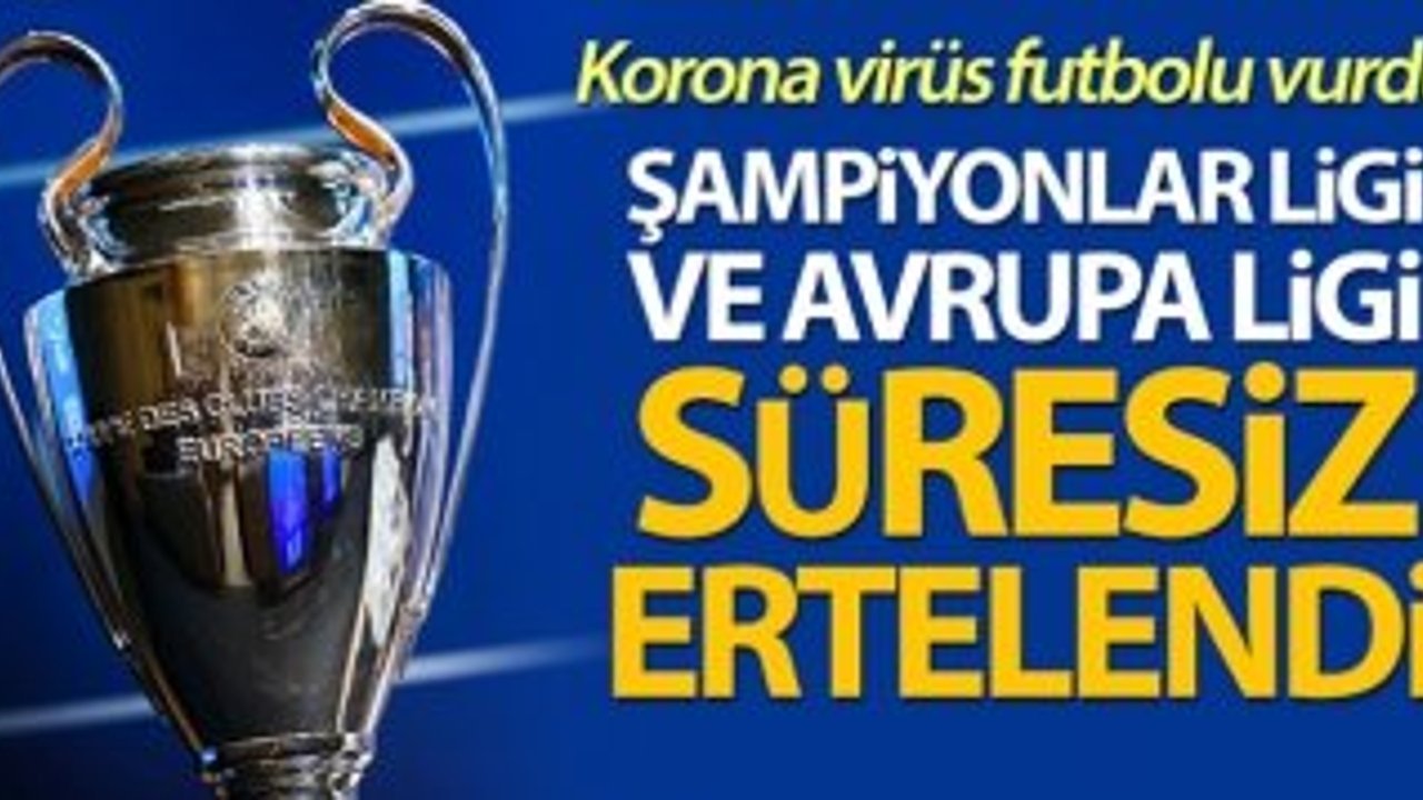 Dünyayı etkisi altına alan korona virüs salgını nedeniyle Şampiyonlar Ligi ve Avrupa Ligi finallerine süresiz erteleme geldi. UEFA'dan yapılan açıklamada, mayıs ayında oynanması planlanan Şampiyonlar Ligi ve Avrupa Ligi müsabakalarının virüs salgınına karşı alınan tedbirler kapsamında askıya alındığı ifade edildi.