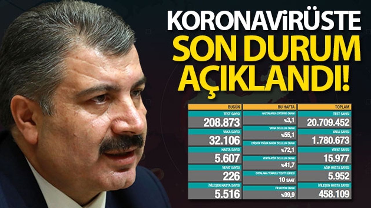 Bugün yapılan 208 bin 873 testten, 32 bin 106 yeni vaka sayısı, 5 bin 607 kişinin de yeni hasta vaka olduğu belirtildi. Toplam vaka sayısının 1 milyon 780 bin 673 olduğu, bugün iyileşen 5 bin 516 kişiyle birlikte toplam iyileşen hasta sayısının 458 bin 109'e yükseldiği, toplam hastalarda zatürre oranının yüzde 3,1, ağır hasta sayısının ise 5 bin 952 olduğu açıklandı.