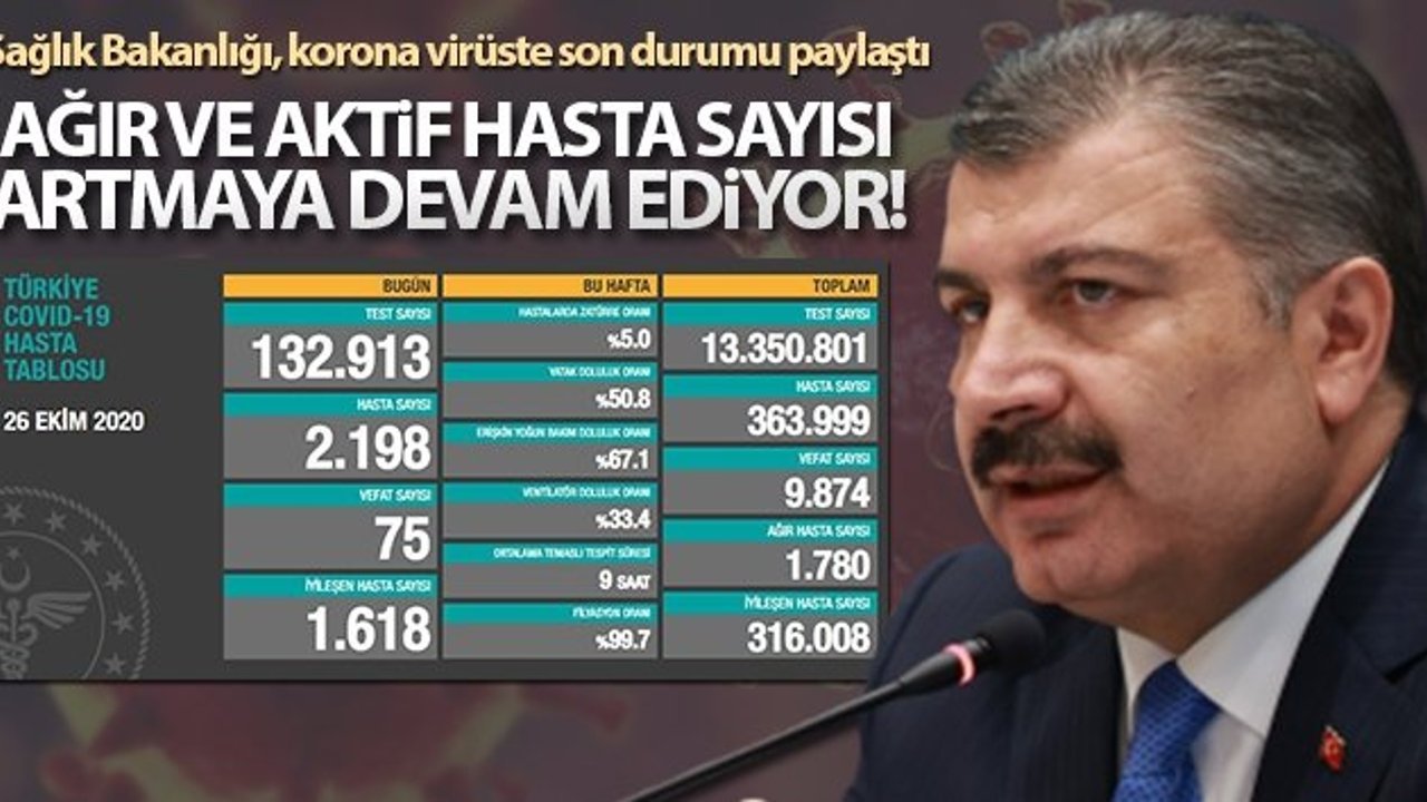 Sağlık Bakanı Fahrettin Koca, sosyal medyadan yaptığı paylaşımda, 'Bugün tespit edilen 2.198 yeni hasta var. Ağır ve aktif hasta sayısı artmaya devam ediyor. Salgının bölgesel tırmanışını durdurmak için birlikte mücadele etmek zorundayız. Tedbirden daha güçlü bir silahımız bugün için yok. Salgına karşı organize olalım' ifadelerini kullandı.