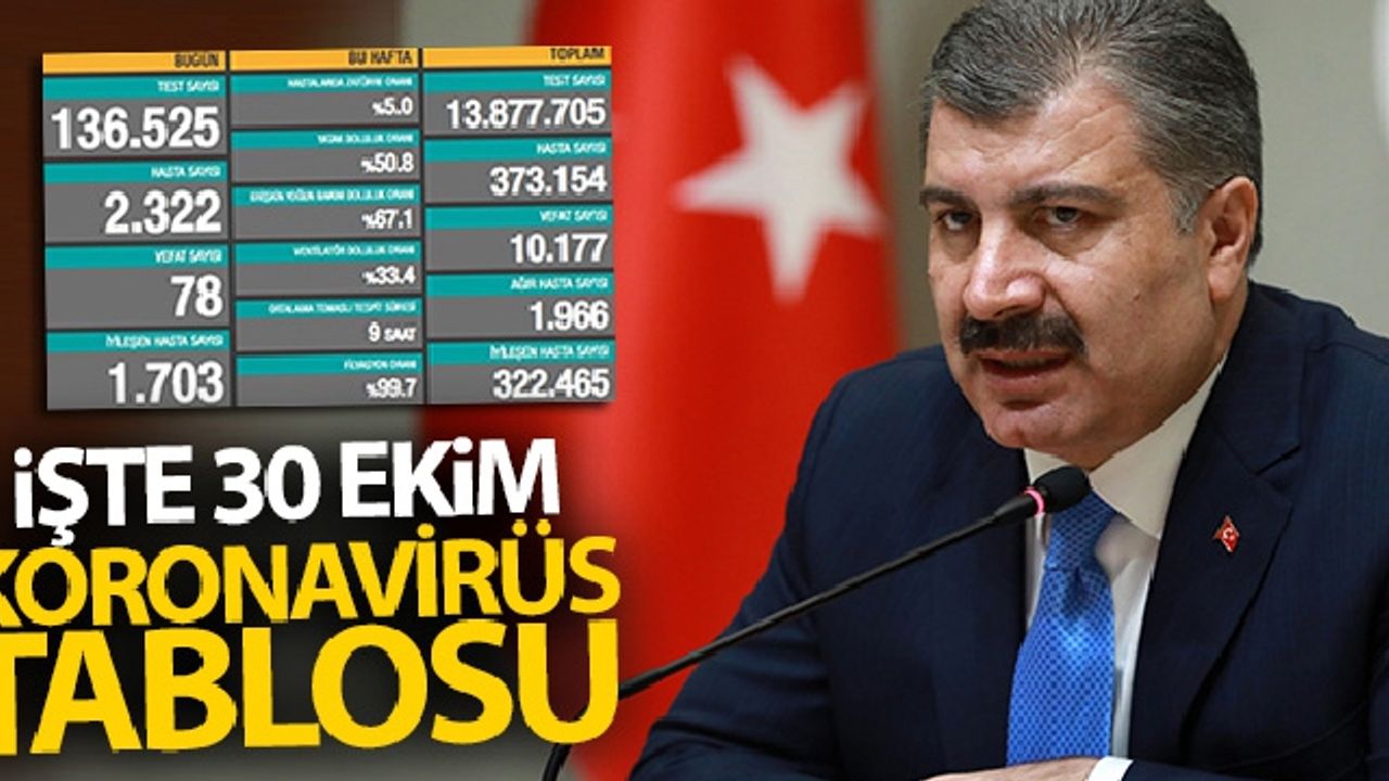 Sağlık Bakanlığının Covid-19 bilgilendirme sayfasında Türkiye'nin güncel korona virüs tablosu kamuoyuyla paylaşıldı. Tabloya göre son 24 saatte 78 kişi korona virüsten hayatını kaybetti, toplam can kaybı 10 bin 177'e yükseldi. Bugün toplam 136 bin 525 test yapılırken, 2 bin 322 yeni vaka tanısı konuldu. Toplam vaka sayısı 373 bin 154 oldu. Bugün iyileşen bin 703 kişiyle birlikte toplam iyileşen toplam hasta sayısı 322 bin 465'e yükseldi. Toplam hastalarda zatürre oranının yüzde 5,0, toplam ağır hasta sayısının ise bin 966 olduğu açıklandı.