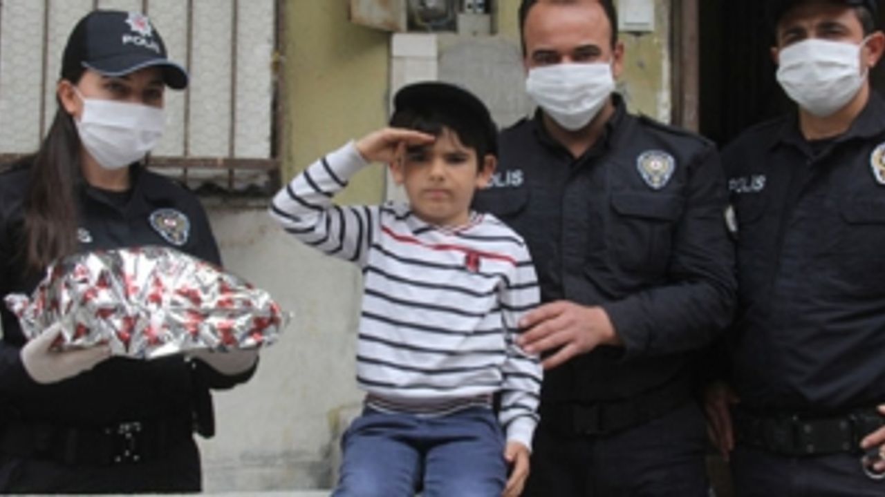 Adana'da, emniyet müdürünün yaşıtlarına oyuncak verdiğini televizyonda görünce kendisi de isteyen çocuğun dedesi 155'i aradı, polisler de küçük Eymen'e sürpriz yapıp sevindirdi.