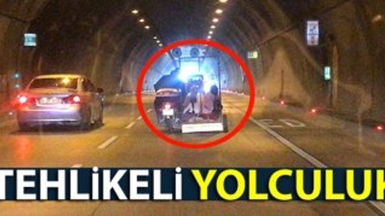 Kağıthane-Piyalepaşa Tüneli'nde dün saat 15.00 sıralarında seyir halinde olan sürücüler gördükleri manzara karşısına şaştı kaldı. Motosiklete ve yanındaki sepete binen 5 kişilik bir ailenin hiçbir önlem almadan canlarını hiçe sayarak yaptıkları yolculuk yürekleri ağza getirdi. Küçük bir çocuğunda olduğu sepetteki tehlikeli yolculuk bu kadarına da 'pes' dedirtti. O anlar ise cep telefonu kamerasına yansıdı.