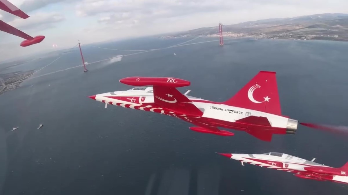 Türk Hava Kuvvetlerinin akrobasi timi Türk Yıldızları, Çanakkale Boğazı'nın gerdanlığı' olarak nitelendirilen 1915 Çanakkale Köprüsü'nün açılış töreninin ardından gösteri uçuşu gerçekleştirdi.