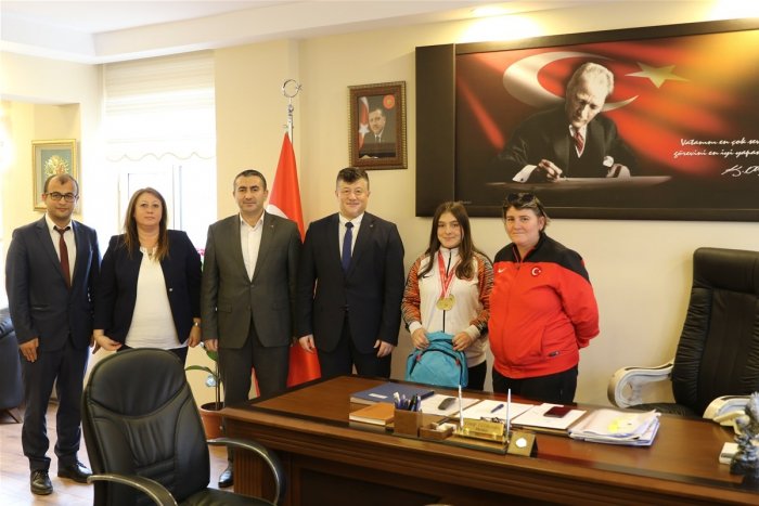 EFELER HABER/MURAT UÇKAÇ-Aydın Gençlik ve Spor İl Müdürlüğü koordinatörlüğünde 10 – 12 Ocak 2020 tarihleri arasında Didim Spor Salonunda gerçekleştirilen 2019 – 2020 Eğitim Öğretim Yılı Okul Sporları Yıldız Halter Türkiye Şampiyonasında Türkiye Şampiyonu olan Burcu İldem Gerçekden, Gençlik ve Spor İl Müdürü Cenap Fillikçioğlu'nu ziyaret etti.