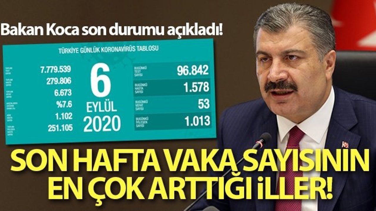 Bakan Koca, paylaşımında, 'Son hafta günlük hasta sayısı en çok artan illerimiz; Van, Karaman, Erzincan, Çankırı ve Kayseri. Ağır hasta sayısı en çok olan illerimiz; İstanbul, Ankara, Konya, Erzurum ve Yozgat. Tedbirlere birlikte uyarak başarılı olabiliriz. Birlikte tedbirli olalım' ifadelerini kullandı.