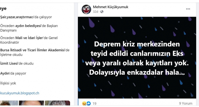 İzmir'de oturan Aile fertlerinden Mert-Eda Küçükyumuk çiftinin 2 yaşındaki çocukları Ateş ile birlikte Bayraklı'da Doğanlar Apartmanı'nda yaşadığını belirten Mehmet Küçükyumuk, yakınlarına ulaşamadıklarını ve aradan geçen süreye rağmen bir haber alamadıklarını da belirterek 'Bayraklı Doğanlar Apartmanı'nda oturan Mert-Eda Küçükyumuk ve 2 yaşındaki Ateş Küçükyumuk'tan haber alamıyoruz. Deprem kriz merkezinde de hastanede yaralı olarak ya da enkazdan çıkarılmış olarak herhangi bir kayıtları yok. Yakınlarımızın enkaz altında olduklarını düşünüyoruz' paylaşımında bulunarak yetkililerden yardım istedi.