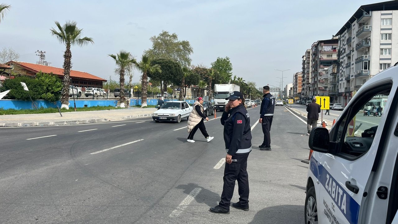 Zaman zaman trafiği durdurarak düzen sağlayan ekipler, araç geçişlerini kontrol altına alırken yayaların da güvenli şekilde karşıya geçmesine yardımcı oluyor.