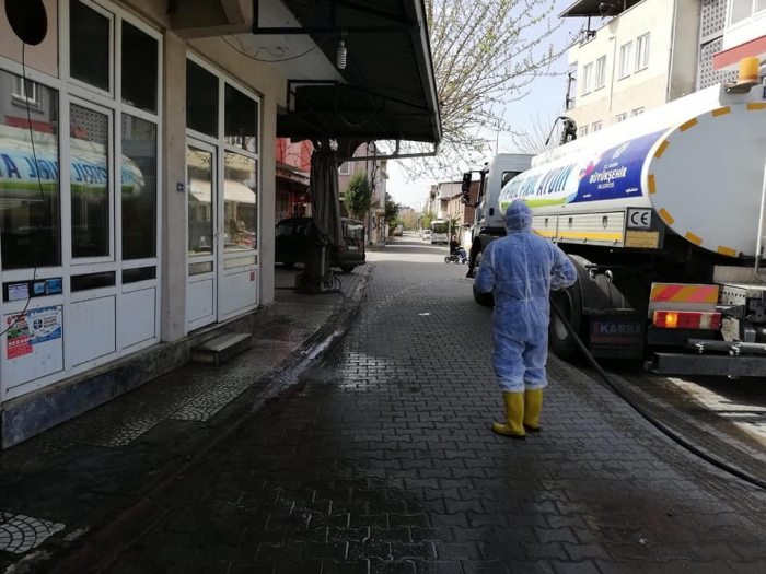 Koronavirüs tedbirleri kapsamında Aydın Büyükşehir Belediyesi ve Yenipazar Belediyesi, ilçedeki caddeleri yıkadı. Hükümet Mahallesi Muhtarı Deniz Eldeniz, Aydın Büyükşehir Belediyesi ve Yenipazar Belediyesi'ne teşekkür etti. (EFELER HABER/MURAT UÇKAÇ)