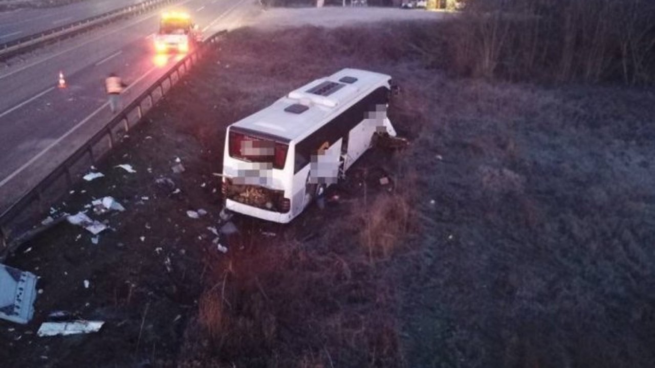Yol kenarındaki çelik bariyerleri yırtarak 50 metre sürüklenen otobüs, yol kenarındaki yamaçtan tarlaya uçtu. Şans eseri devrilmeyen otobüste 33 yolcudan 12'si yaralandı.