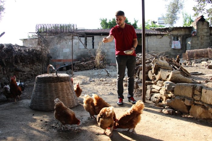 Çine'ye bağlı Kızılgüney Mahallesi'nde yaşayan Kenan Yıldırım, sabah kalkıp tavukları kümeslerinden bahçeye saldı ve yemledi.